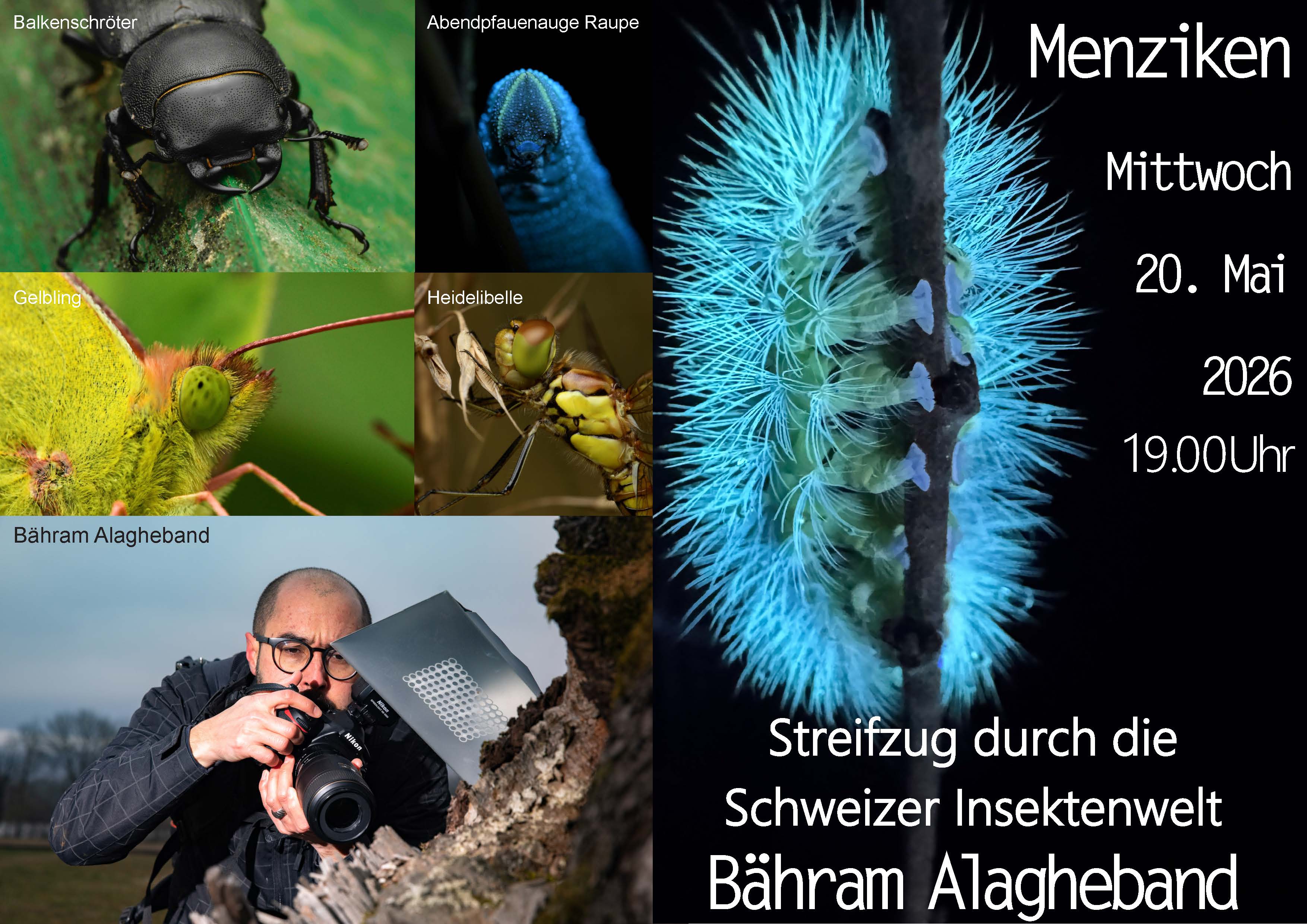 Was krabbelt alles vor unserer Haustür? Muss ich angst haben vor einer Wespe die einen vier Zentimeter langen Stachel hat? Tierfilmer Bähram Alageheband nimmt dich mit in die Welt der Schweizer Insekten und zeigt anhand von Bildern, Videos und persönlichen Erlebnissen, was unsere Insekten alles können.